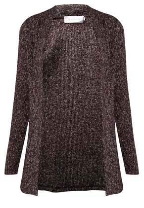 Saco Anna Flynn color café, confeccionado en poliéster. Su diseño es abierto,