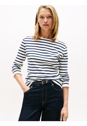 Saco de manga larga con diseño de canalé fino y cuello barco adornado con sutiles volantes que aportan un aire femenino y elegante. Su tejido suave garantiza comodidad, convirtiéndola en una prenda versátil para looks casuales y sofisticados.Características• Confeccionado en algodón regenerativo• Tejido de canalé 1x1 con textura elástica• Cuello barco• Diseño de rayas• Detalles distintivos de Tommy Hilfiger• Logo de Tommy Hilfiger bordado en el pechoTalle y corte• Manga largaComposición y cuidados• 100% Algodón regenerativoModelo: WW0WW473810FK