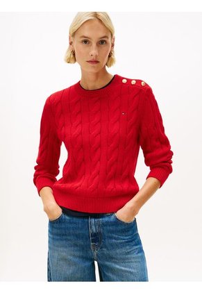 Saco de punto con diseño de trenzas y detalle de botones dorados que aporta un toque elegante y sofisticado. Su tejido suave y cómodo lo convierte en una prenda versátil, perfecta para looks casuales o más formales.Características• Confeccionado en algodón BCI• Detalle de botones dorados en el hombro• Cuello redondo• Terminaciones acanaladas en puños y dobladillo• Detalles distintivos de Tommy Hilfiger• Logo de Tommy Hilfiger bordado en el pechoTalle y corte• Manga largaComposición y cuidados• 100% Algodón BCIModelo: WW0WW47387XLG