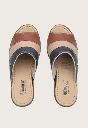 Para lucir radiante en las zonas de clima cálido, elige calzado Romulo. Esta sandalia con bandas frontales de color, serán tus mejores aliadas cuando debes mantener tu imagen seria y cómoda. Su diseño fue pensado para la mujer contemporánea que no pierde su estilo. Calzado Romulo, bienestar para tus pies.
