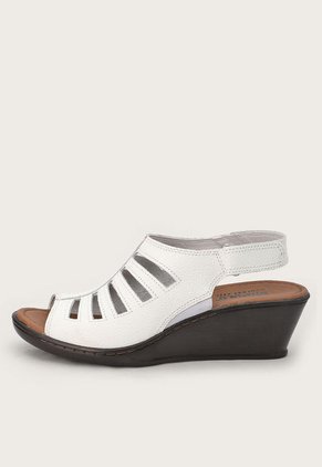 Lleva lo mejor del calzado nacional con Calzado Romulo. Esta sandalia de tacón corrido para mujer, en cuero color marfil con con sistema de cierre con velcro que permite que el calzado se ajuste a distintos anchos del pie. Bienestar para tus pies, que adquieres a través de dafiti.
