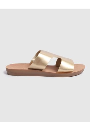 Calzado tipo sandalia para mujer,Diseño de silueta abierta de calce rápido,Capellada ancha con cortes laterales decorativos,Superficie con acabado metalizado de alto brillo,Tono dorado champán uniforme,Plantilla anatómica con acolchado para mayor soporte,Suela plana de perfil bajo en tono natural contrastanteEspecificaciones:Color: DoradoComposición: Capellada:Sintético 100% Forro:Sintético 100% Suela:Sintético 100% Plantilla:Sintético 100%Instrucciones de Lavado:No dejar en remojoLavar en agua fría separadamenteNo usar blanqueadorNo retorcerSecar a la SombraPlancha tibiaHecho en ChinaGarantía: 60 Días.