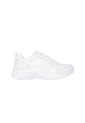 Estos tenis junior ofrecen una mezcla ideal de funcionalidad, confort y estilo versátil. Confeccionados con una parte superior de material sintético liso y detalles perforados, brindan un ajuste cómodo y transpirabilidad para el uso diario. La estructura ligera y su suela de tracción flexible permiten un movimiento natural y estable, mientras que el diseño totalmente en blanco los convierte en una opción práctica para uniformes escolares o looks casuales. El logo lateral en relieve y los cordones tradicionales completan su apariencia moderna y limpia.