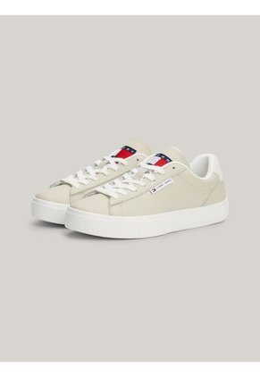 Estas elegantes tenis con cordones presentan una moderna suela cupsole de goma y un exterior con paneles de cuero a contraste y un intrincado detalle distintivo en bajo relieve.Características• Exterior de cuero y poliuretano• Interior de algodón y algodón reciclado• Plantilla extraíble de poliuretano, poliuretano reciclado y goma termoplástica reciclada• Suela de goma y caucho• Producido según los estándares de la organización Better Cotton Initiative• Suela cupsole• Parche de Tommy en la lengüeta• Logo de Tommy Jeans en bajo relieve en el talón• Detalles distintivos de Tommy JeansTalle y corte• Con cordones• Diseño de corte bajo• Punta redondaComposición y cuidados• 90 % Cuero, 10 % Poliuretano