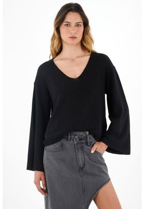 ¡Básicos pero más renovados! Un buzo es una pieza esencial en cualquier clóset femenino, y con éste, además de lograr looks en segundos, podrás destacar con el estilo cool que te define. Características- Color: negro-Cuello en V-Manga acampanada-Tejido-Terminaciones en rib-Material: Algodón 100% Sobre el fit Con su silueta amplia estarás cómoda en cada ocasión y su manga acampanada siempre te dará un toque más sofisticado.