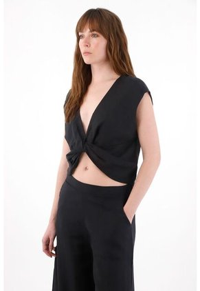 ¡Fresca y sofisticada! Diseños versátiles que evocan ligereza y frescura, perfectos para dominar el streetwear. Características- Color: negro - En lino - Manga sisa - Cuello en V - Diseño entorchado en delantero - Silueta amplia - Material: Lino 100% Sobre el fit Esta camisa es perfecta para los días más calurosos. Lúcela con shorts de lino para un look de playa o con faldas para dominar la ciudad.