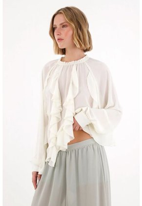¡Irresistiblemente bohemia! Fluida, con boleros y texturas que la harán ser parte de tu colección más ecléctica. Características * Color: crudo * Tela con caída * Cuello redondo * Manga larga tipo raglán * Diseño con boleros en mangas y delantero * Silueta fresca y fluida * Material: Poliéster 100% Sobre el fit Una silueta fresca y llena de movimiento, diseñada para robarse todas las miradas cada vez que la uses.