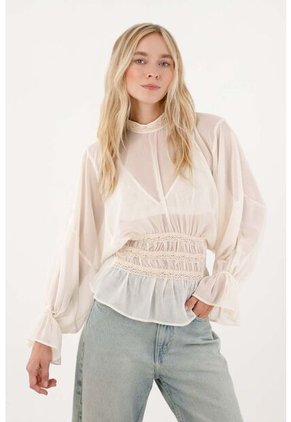 ¡Romántica y con mucho movimiento!Esta camisa en chifón captura la esencia de lo femenino con un juego de transparencias sutiles y detalles que elevan lo delicado a protagonista. El cuello alto con bolillo y los cortes con recogidos en el delantero crean un efecto etéreo, mientras las mangas largas con recogido aportan volumen ligero y sofisticación.Confeccionada en tela chifón fluida, su diseño integra elástico en los puños para un ajuste cómodo y un nido de abeja en la cintura baja posterior que define la silueta.Sobre la colección: Parte de la colección inspirada en la sutileza y la ligereza, donde los detalles artesanales y las texturas livianas convierten lo cotidiano en extraordinario.