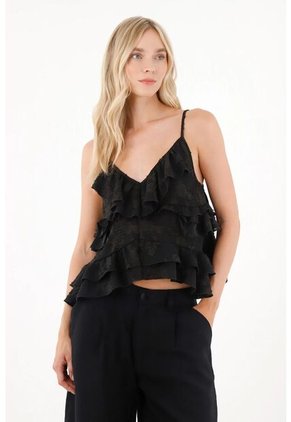 ¡Para esos días que piden un look fresco, ligero y lleno de movimiento!Su diseño de tiras y boleros aporta un toque romántico y delicado, ideal para combinar con tus jeans favoritos o una falda para un plan casual chic. Perfecta para cafés con amigas, paseos al aire libre o un almuerzo de fin de semana, dejando que tu estilo fluya con libertad.Confeccionada en tela bordada de textura suave y transpirable, con escote en V que resalta el cuello y boleros estratégicamente ubicados que aportan volumen y movimiento.Sobre la colección: Forma parte de nuestra colección de tops versátiles y femeninos, pensada para quienes buscan piezas con estilo effortless. Atrévete a combinarla y darle tu toque personal a cada look.