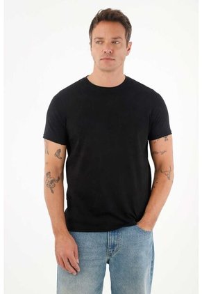 ¡Piezas que no se ven dos veces! Esta camiseta juega con un efecto lavado único que le da personalidad y actitud, como si llevara años siendo tu favorita. Características* Color: negro * Jersey * De tacto suave * Estampado que simula efecto desgastado * Material: Algodón 96% Elastano 4% Sobre el fit Tiene un corte súper relajado y cómodo que se adapta fácil a tu día a día. Además, el tejido liviano y suave cae con naturalidad sobre el cuerpo, ideal para que puedas moverte sin complicaciones.