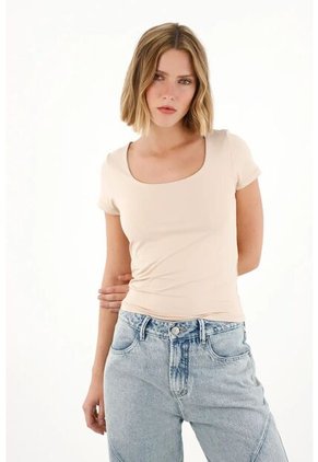 ¡La base que todo look necesita! Esta camiseta es un must del clóset femenino. Características * Color: Blanca * Básica * Escote redondo profundo * En tela de punto * Manga corta con terminación diagonal * Largo pretinero * Material: Poliamida 85% Elastano 15% Sobre el fit Una silueta versátil, fresca y con el twist delicado que tanto amas. Podrás llevarla con outfits casuales o hacer combinaciones para un estilo más formal, ¡esa es su ventaja!
