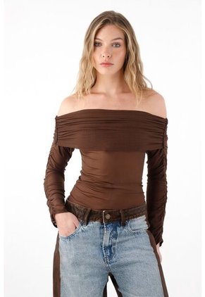 ¡La pieza que faltaba en tu clóset para tus looks más icónicos! Esta blusa en malla transparente es el balance perfecto entre delicadeza y estilo, con un escote bandeja que resalta tus hombros y detalles recogidos en los costados para una silueta favorecedora. Características* Color: café * Escote bandeja con doblez * Recogidos en costados * Manga larga * En malla con transparencia * Material: Poliéster 94% Elastano 6% Sobre el fit Ceñida en el cuerpo y con la elasticidad justa para adaptarse a tu figura. Llévala con jeans, faldas o pantalones de cuero para un outfit que rompe esquemas.