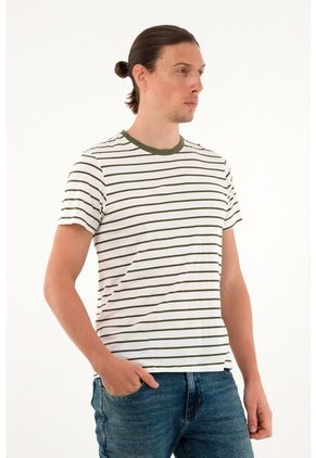 ¡Versatilidad que redefine el estilo! Una camiseta ideal para crear combinaciones de formales a casuales. Características - Color: crudo - Silueta regular - Cuello redondo en rib - Manga corta - Estampado a rayas - Material: Algodón 100% Sobre el fit Con un toque moderno y estampado vibrante, esta camiseta acompañará días llenos de aventura.