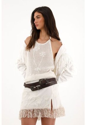 ¡Delicada y llena de estilo! Con detalles únicos y un diseño ligero, esta camiseta es ideal para destacar en cualquier ocasión. Características- Color: crudo - Tejido abierto - Cuello halter - Ajuste con tiras en cuello posterior - Elástico en escote posterior - Bordado de flores - Terminaciones ondeadas - Pretinera - Material: Acrílica 50% Modal 50% Sobre el fit Esta camiseta está pensada para ajustarse con suavidad y resaltar tu figura gracias a su diseño halter y el elástico en la espalda. Los bordados y las terminaciones ondeadas le dan un aire único y sofisticado.