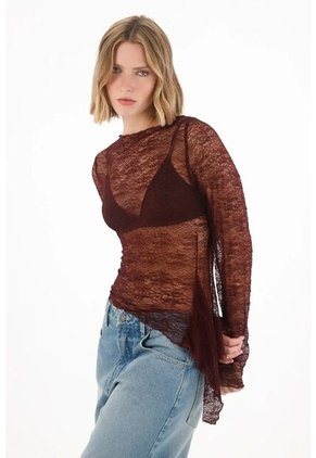 ¡Un guiño audaz a la feminidad moderna! Esta camiseta en blonda con transparencias es la pieza que redefine el estilo boho con un aire actual y sofisticado. Características * Color: rojo * Manga larga * Cuello bandeja * Tela tipo blonda con transparencia * Largo pretinero * Ruedo en diagonal * Material: Poliamida 92% Elastano 8% Sobre el fit Una silueta delicada y femenina que abraza el cuerpo con sutil sensualidad. El largo pretinero la hace fácil de combinar con prendas de tiro alto, mientras que el ruedo diagonal añade movimiento y un detalle inesperado a tu look.