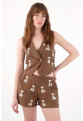 Tennis Chaleco En 100% Lino Con Bordado Café Para Mujer