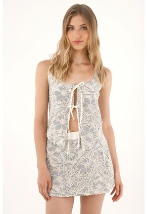 ¡Toda la esencia TNS en un mismo diseño! Este crop cuenta con un mix de texturas y bordados que le dan el toque especial a cualquier look. Características* Color: crudo * Crop * Manga sisa * Cuello en V * Sesgo en delantero para anudar * Forro en delantero * Terminación en punta * Mix de telas * Flores con diseño a rayas * Bordado delantero * Material: Forro: Algodón 100% Exterior: Algodón 100% Sobre el fit Su ajuste con sesgos en el frente y terminación en punta crean un efecto favorecedor y estilizado.