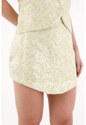 ¡Brillar nunca había sido tan fácil! Este diseño equilibra elegancia y libertad, perfecto para lucir un estilo único en las festividades de la temporada. Características- Color: crudo - Corta - Cierre invisible al costado - Diseño con lentejuelas - Terminación frontal en punta - Material: Forro: Viscosa 100% Exterior: Poliéster 89% Viscosa 11% Sobre el fit La silueta que redefine el término elegancia. Combínala con su chaleco en set para crear un look auténtico.