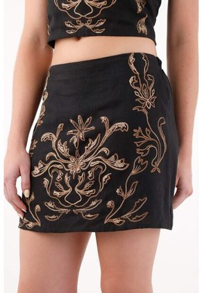 ¡Brilla sin esfuerzo! El lino es frescura, la moda es fácil y ligera, y esta falda lo demuestra. Características* Color: negro * Corta * En lino * Silueta recta * Diseño con técnicas de bordado y estampación en delantero * Elástico en pretina posterior * Material: Forro Viscosa 100% Exterior: Lino 100% Sobre el fit Lúcela con su camisa a juego y crea un total look que funcionará de la oficina al fin de semana.