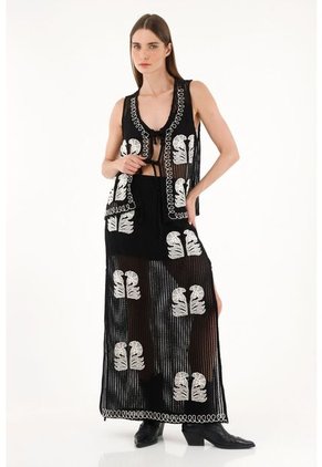 ¡El boho es la tendencia favorita! Este diseño tejido creará looks boho chic para transformar la cotidianidad. Características- Color: negro - Larga - Tipo tejida - Detalles desagujados - Pretina elástica - Aberturas en costados - Bordados en frente - Material: Forro Viscosa 95% Elastano 5% Exterior Poliéster 65% Algodón 35% Sobre el fit Un diseño que abraza las tendencias, combínalo con su prenda a juego para crear un estilo libre y llamativo.