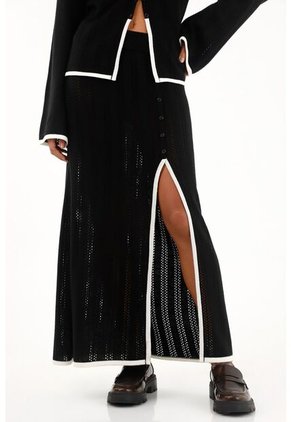 ¡Un diseño que vibra con tu esencia libre! Esta falda renueva el estilo clásico, creando looks que van más allá de las tendencias. Características- Color: negro - Midi - Tejida - Pretina elástica - Botones decorativos en frente - Abertura en delantero - Ruedo en contraste de color - Material: Acrílica 100% Sobre el fit Al combinar este diseño con su camisa a juego, tendrás un estilo único.