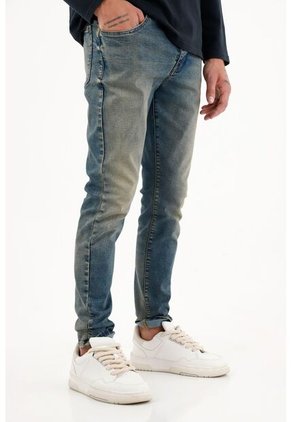¡Para que disfrutes de tus mejores momentos mientras luces increíble! Este jean está hecho justo a la medida de tu estilo. Características- Color: azul - Tiro medio - Ajuste de botones - Cinco bolsillos - Tono medio - Dirty tipo vintage - Realce en costuras - Material: Algodón 68% Poliéster 30% Elastano 2% Sobre el fit Los Super Skinny se ganaron tu corazón porque destacan tu figura sin restarte comodidad.