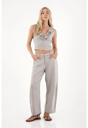 ¡Veraniego, llamativo y actual! De looks semiformales, a otros más playeros, este pantalón te garantizará estilo y sofisticación siempre. Características * Color: gris * Confeccionado en lino * Horseshoe * Tiro medio * Bolsillos laterales * Material: Lino 100% Sobre el fit Su tejido asegura frescura infinita y libertad de movimiento para que, sin importar el plan, te sientas cómoda y a la moda.