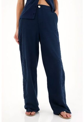 ¡Sofisticación en cada detalle! Este pantalón es el match perfecto entre elegancia y frescura. Características* Color: azul * Recto * Tiro medio * Apariencia lino * Ajuste con botón y cierre * Pasadores en pretina * Bolsillos delanteros * Bolsillos de parche en posterior * Detalles bordados en delantero * Material: Algodón 100% Sobre el fit Su apariencia lino lo hace ideal para esos días en los que quieres sentirte ligera sin perder el estilo, mientras que los bordados en delantero le suman un toque especial. Úsalo con su camisa en set y eleva el resultado.