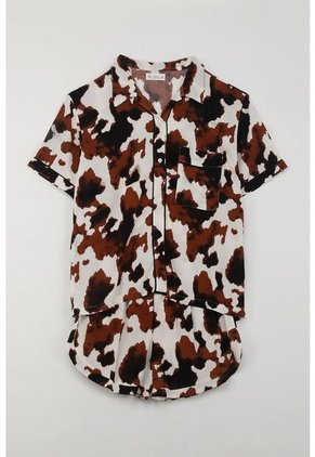 ¡Dulces sueños! Con su acabado cool y silueta relajada, esta pijama evoca sofisticación y confort. Características* Color: multicolor * Pijama * Set de camisa y short * En chalis * Estampado animal print * Camisa bowling * Perilla de botones con vivo en contraste * Manga corta * Puños en pieza con vivos en contraste * Bolsillo de parche * Short con pretina elástica * Ruedo curvo en pieza * Material: Viscosa 100% Sobre el fit Un diseño pensado para relajarte con estilo, ya sea en una noche de skincare o en un desayuno frente a las montañas.