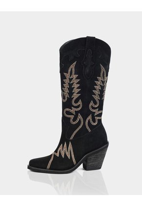 - • Material: Tipo gamuza• Caña media-alta• Bordados decorativos de inspiración western• Punta levemente afinada• Taco ancho de altura media para mayor estabilidad• Diseño western contemporáneo• Color: Negro