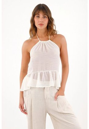 ¡Un guiño sofisticado a lo etéreo! Una pieza que, gracias a su tela vaporosa y suave, con transparencia sutil, aporta esa vibra fresca y femenina que fluye de día a noche sin esfuerzo. Características * Color: crudo * Cuello halter * Tiras que anudan en cuello * Corte con bolero * Tela vaporosa y suave * Transparencia sutil * Material: Poliéster 100% Sobre el fit Una silueta amplia y relajada que cae con naturalidad, permitiendo destacar la ligereza de la tela.