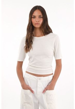 ¡Básicos con un toque inesperado! Esta camiseta se convertirá en el nuevo statement. Su escote profundo en la espalda y la textura sutil la convierten en esa pieza que eleva cualquier look casual. Características* Color: crudo * Cuello redondo * Manga 3/4 * Tela con textura * Escote profundo en espalda * Material: Poliéster 65% Algodón 33% Elastano 2% Sobre el fit Deja que sus detalles hablen por ti. Combínala con jeans o pantalones y crea looks versátiles para días con amigas o citas especiales.