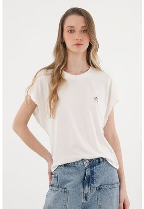 ¡Pasada de estilo! Una camiseta perfecta para tus looks diarios, sin perder ese toque de originalidad que te define. Características- Color: crudo - Manga sisa rodada - Cuello redondo - Silueta oversize - Bordado decorativo en punto corazón - Material: Algodón 100% Sobre el fit Una silueta amplia, ideal para quienes aman estar cómodas y a la moda al mismo tiempo.