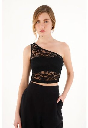 ¡Feminidad con actitud! Este crop top de encaje combina detalles delicados y un diseño moderno, perfecto para añadir un toque romántico y versátil a tus looks. Características- Color: negro - Crop top - De un solo hombro - En tejido de encaje - Material: Poliamida 79% Elastano 21% Sobre el fit Su silueta es perfecta para realzar cualquier outfit con un aire moderno y sofisticado.