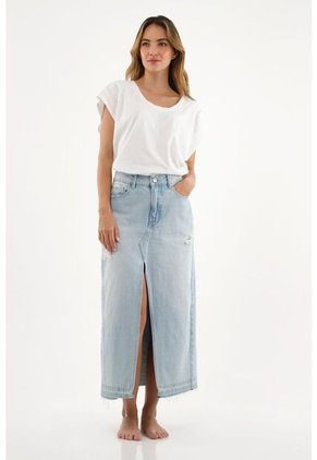 ¡Una prenda en denim para cada día! Participa de las mejores tendencias y vístete con una falda tan auténtica, llamativa y versátil como esta. Características-Colo: azul - Denim - Cinco bolsillos - Abertura en frente - Lavado claro - Con rotos - Ruedo al corte - Material: Algodón 100% Sobre el fit Larga para que puedas lucirla con tranquilidad y estilo en cualquier momento del día.