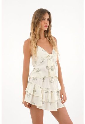 ¡Movimiento, color y un twist coqueto! Una falda corta que te lleva a los mejores lugares, con print vibrante y boleros que suman estilo. Características* Color: crudo * Corta * Estampada * Pretina elástica * Boleros * Forro interno * Material: Forro: Viscosa 100% Exterior: Algodón 55% Lino 45% Sobre el fit Llévala con camisetas o tops boho y hazla protagonista de tu día.