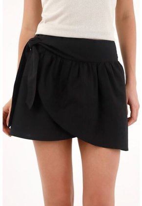 ¡Lo tiene todo! Esta falda es de esas piezas atemporales que siempre agradeceremos tener en el clóset. Características- Color: negro - Corta - Pretina lisa en frente - Nido de abeja en pretina posterior - Tapa cruzada que anuda en costado delantero - Detalle recogido en frente y posterior - Material: Algodón 100% Sobre el fit Una silueta femenina y versátil que se adapta a tu figura con un ajuste cómodo y fluido. Perfecta para elevar cualquier look con un toque de estilo effortless.