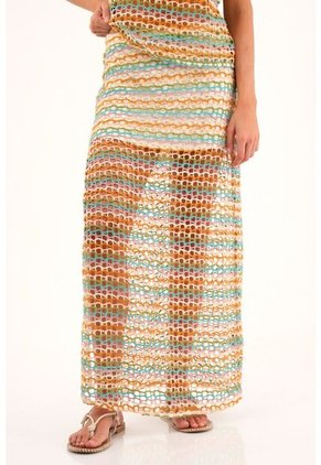 ¡Atrévete a destacar con esta falda! Su diseño multicolor y tejido abierto aportan frescura y dinamismo a tu look. Características - Color: crudo - Larga - Tejido abierto - Diseño multicolor - Pretina lisa en frente - Pretina elástica en posterior - Forro interno corto - Aberturas en costados - Material: Forro: Algodón 100% Exterior: Poliéster 100% Sobre el fit El diseño largo y tejido abierto permiten que esta falda sea perfecta para combinar con su camiseta en set para lograr un total look lleno de vida y frescura.