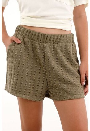 ¡Hay siluetas que cuentan historias y texturas que le dan la inspiración! Este short combina lo relajado con lo especial, perfecto para días con encanto y mucho sol. Características* Color: verde * Short * Pretina elástica * Bolsillos funcionales en diagonal * Tela tejida con detalles desagujados * Tela liviana con forro interno * Tiro medio * Silueta regular * Material: Poliéster 100% Sobre el fit Su textura y transparencia sutil elevan cualquier look sin dejar de ser comfy. Perfecto para acompañar con su camisa en set y dejar que el total look se robe todo el protagonismo.