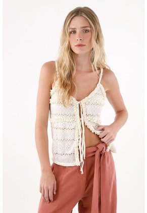 Romance urbano que deja respirar la piel.Un top de tirantes en color crudo con textura calada que aporta un aire artesanal y fresco a tus looks. Las pequeñas ondas de volantes recorren el escote y el cuerpo, sumando relieve y una vibra femenina sin excesos. El frente se encuentra rematado por un lazo con tiras largas que crea un foco visual sutil y muy actual. Confeccionado en poliéster con 4% de elastano, su caída acompaña la silueta sin perder definición.Fit & Styling Corte recto al torso, largo a la cadera y tirantes finos. Llévalo con el lazo centrado para destacar el escote y potencia la textura calada. Look clave: combínalo con un pantalón de tiro alto, fluido, en tono terracota; úsalo por dentro para definir la cintura y lograr un estilo casual contemporáneo perfecto para la ciudad.