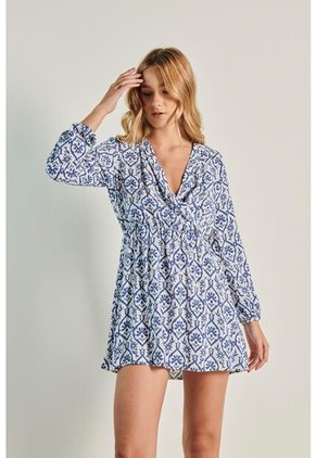 Vestido corto para mujer en tono azul intenso cuenta con escote en V, diseños estampados, manga larga, elástico en puños, recogido en la falda y una silueta holgada. Esta prenda será la opción perfecta para lucir en los climas cálidos. ¡Con un sombrero y unas sandalias te verás fenomenal!