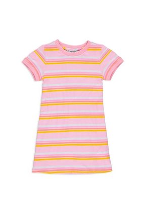 Vestido de Niña cuello redondo manga corta juego de rayas horizontales en tonos pasteles elástico en espalda una prenda cómoda y fresca ideal para una tarde de juegos.