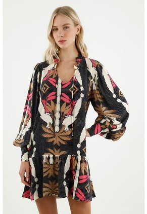 ¡Pop de estilo para tus días! Este vestido se convertirá en tu nuevo favorito de la semana para lucir delicada, femenina y súper moderna. Características• Color: multicolor • Estampado • Corto • Manga larga • Puño con botones • Mini bolero en cuello • Escote en V • Tiras para anudar en cuello • Ruedo en bolero • Material: Viscosa 100% Sobre el fit Dale un toque auténtico y especial a tus looks del verano.
