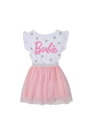 La icónica muñeca Barbie está presente en la vida de las niñas en todo momento, nada más divertido que portar elementos que reflejen su empoderamiento y a la vez sean funcionales, Barbie no solo es una muñeca para jugar, es un personaje que inspira, acompaña e invita a cumplir sueños.Para esos momentos en que quiere ser única, tierna e inspiradora nada mejor que un vestido como este, sus materiales de gran calidad y sus delicados estampados y la falda en tul la harán sentir segura y perfectamente vestida para cualquier ocasión.Recomendaciones de cuidado:Lavar con jabón suave.Lavar con colores similares.No usar cloro ni blanqueadores.Lavar a máquina con agua fría en ciclo delicado.Enjuague sin exprimir.No planchar.Secar a la sombra.