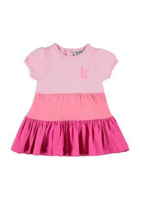 Vestido de Bebe niña cuello redondo manga corta con corte en bloque de color en tonos rosados y fucsia una prenda casual para toda ocasión