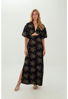 Vestido largo estampado con delicado detalle entorchado en escote que forma abertura sutil y delicada. Su diseño con mangas cn volumen y aberturas laterales en la falda aportan movimiento.La modelo usa un vestido talla S.