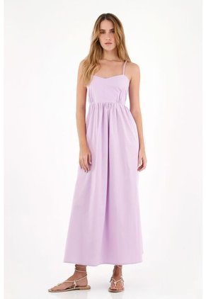 ¡Al mejor estilo TNS! Sabemos que un vestido como este, hará que tus días sean más auténticos y memorables. Características- Color: morado - En popelina - Largo - De tiras entorchadas graduables - Escote corazón - Detalle anudable en posterior con abertura - Material: Algodón 97% Elastano 3% Sobre el fit Una silueta clásica y muy femenina, ideal para días por la ciudad o planes especiales en familia.