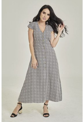 Vestido largo en chalís estampado, cuello en V con perilla completa, ajusta en cintura, manga corta. RAGGED es una empresa competitiva y sólida que cuenta con más de 30 años de experiencia con su propuesta de diseño y moda,