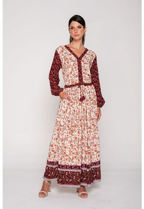 Vestido para mujer largo, estampado, mix and match en mangas, perilla, cintura y parte inferior del vestido. Con ajuste en la cintura a través de un elástico, tiene escote en v profundo y tira de amarre en la cintura. Silueta amplia. Una prenda versátil para el fin de semana y oficina. Combínalo con hermosos accesorios lisos.