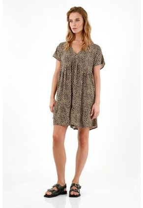 ¡El vestido que tu clóset pide a gritos! Renueva tus outfits e incluye esta pieza de moda en tus días casuales para darle un toque más llamativo. Características- Color: café - Estampado - Corto - Manga corta - Material: Viscosa 100% Sobre el fit Ideal para que te sientas cómoda y fresca, sin perder el estilo.